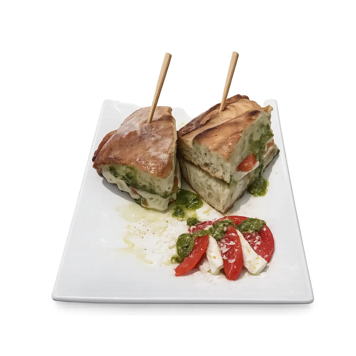 Vine-ripened tomatoes, Mozzarella di Bufala, shaved Parmigiano-Reggiano, house basil pesto.