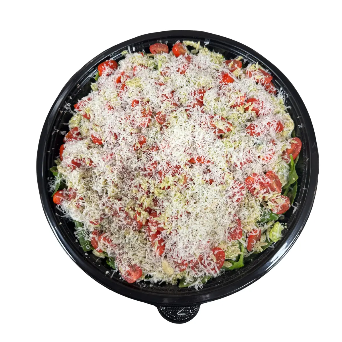 Organic baby spinach and Romaine hearts, roasted chicken, Heirloom cherry tomatoes, Parmigiano Reggiano, basil Pesto and white wine vinaigrette.
