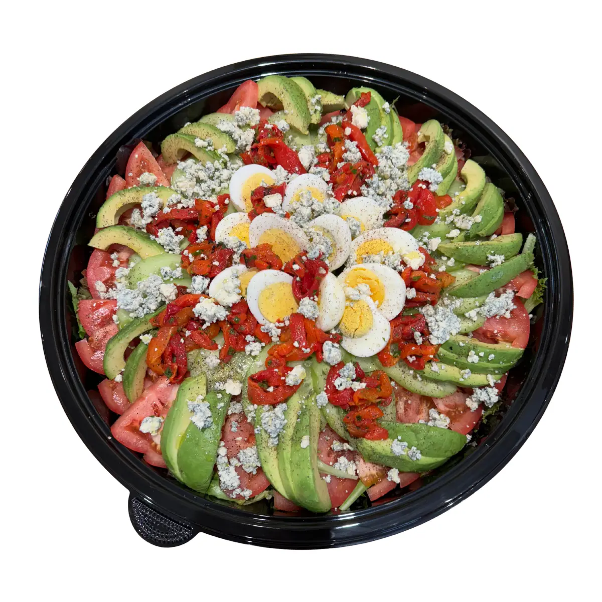 Organic mesclun salad, caved aged blue cheese, avocado, English cucumber, vine-ripened tomatoes, roasted red peppers, hardboiled egg, balsamic vinaigrette.