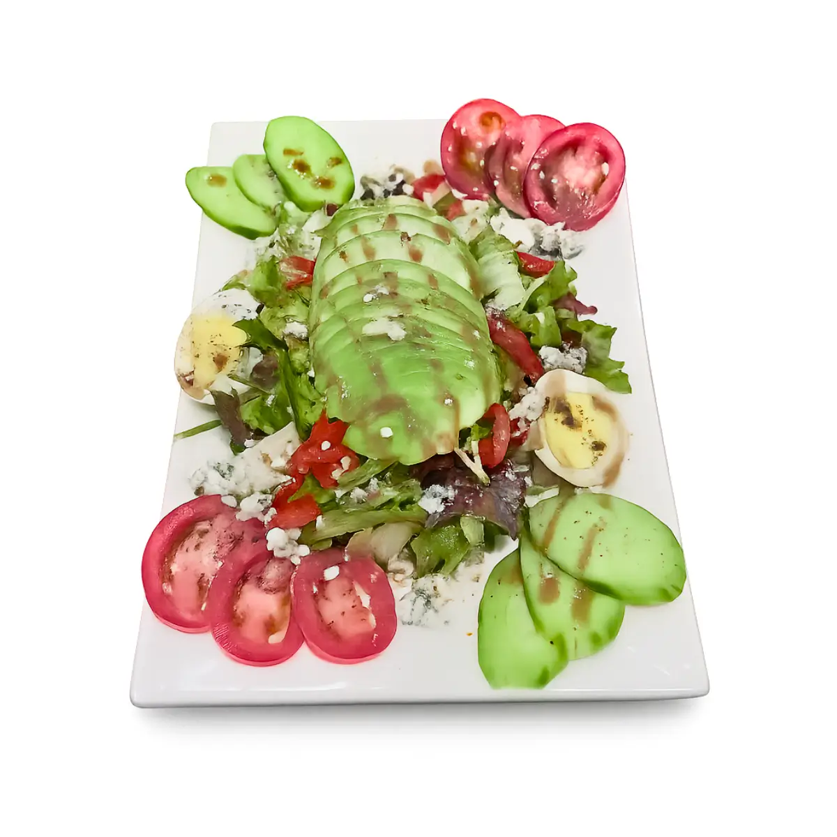Organic mesclun salad, caved aged blue cheese, avocado, English cucumber, vine-ripened tomatoes, roasted red peppers, hardboiled egg, balsamic vinaigrette.